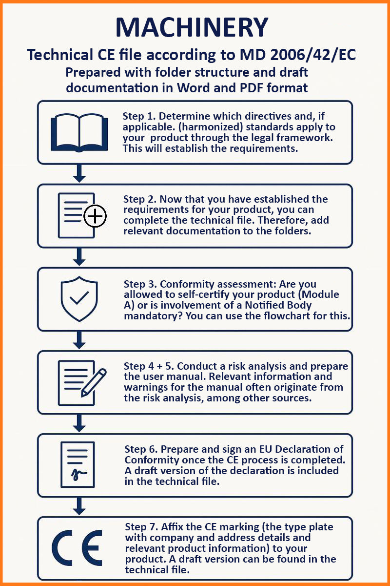 In this example technical file, the minimum applicable directives have been worked out on a machine "assembly". The editable documents are of course fully customizable by yourself.