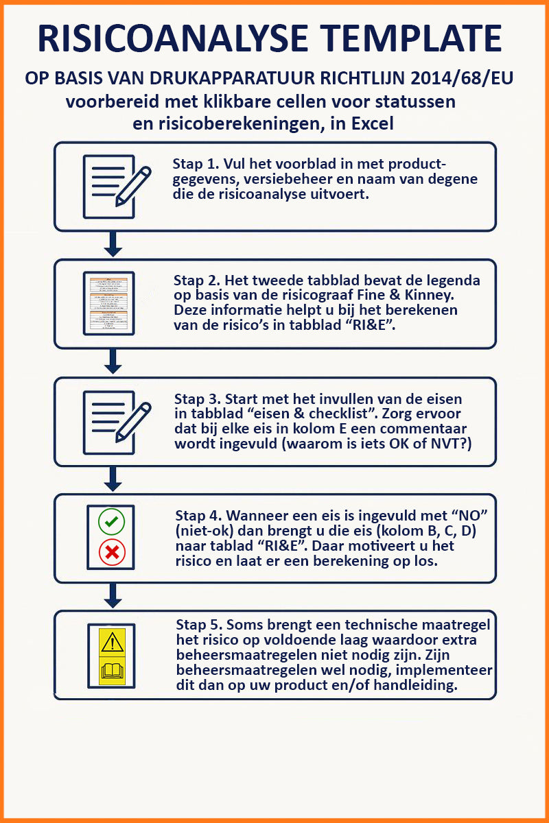 Deze risicoanalyse (in XLS) bevat de veiligheidseisen van de PED Richtlijn in combinatie met de Laagspanningsrichtlijn. De Fine & Kinney methode is in de XLS geïntegreerd.