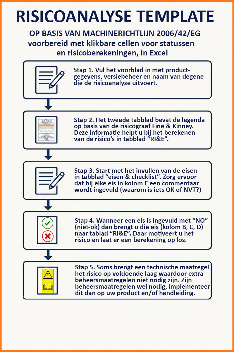 Deze risicoanalyse (in XLS) bevat de veiligheidseisen van de Machinerichtlijn, de EMC Richtlijn en de Laagspanningsrichtlijn. De Fine & Kinney methode is in de XLS geïntegreerd.