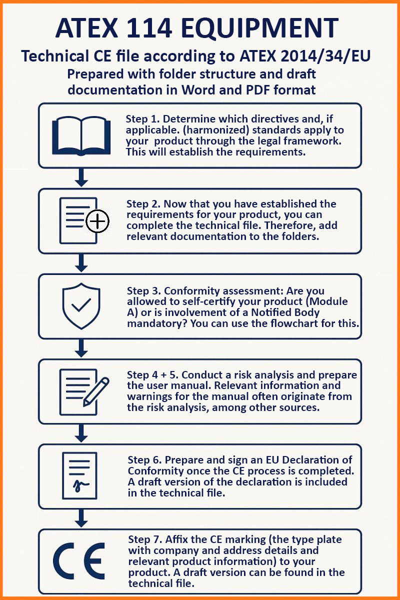 In this example technical file, the requirements for ATEX 114 legislation have been elaborated. The editable documents are of course fully customizable by yourself.